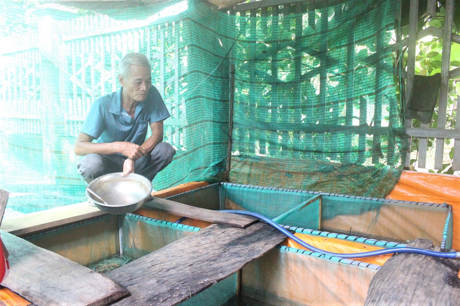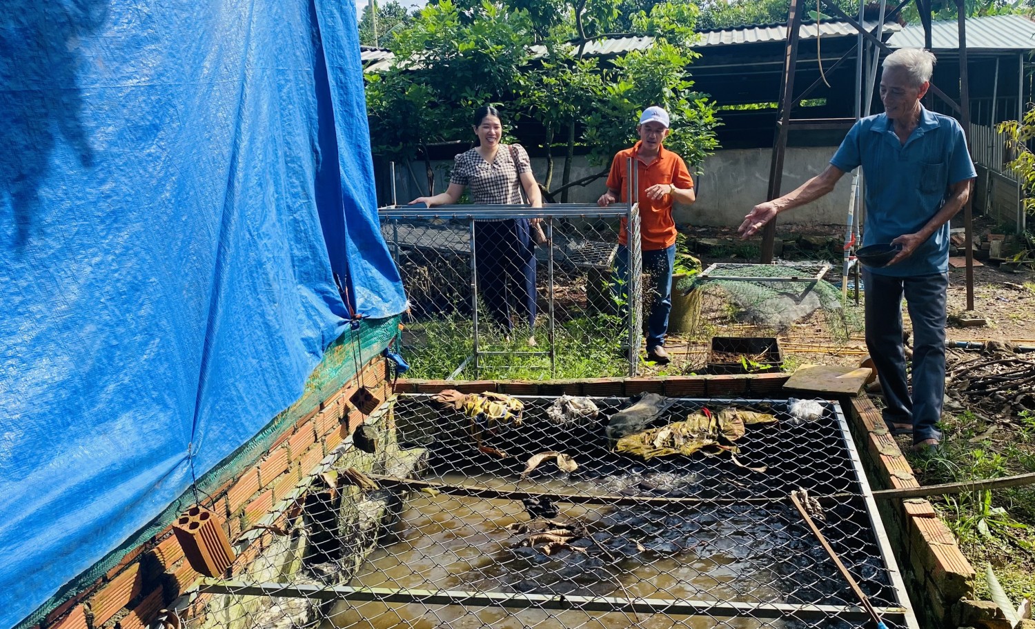 Ông Nguyễn Kim Sao tận dụng phế phụ phẩm từ phân và nước nuôi lươn để nuôi cá làm nguồn thức ăn cho heo.